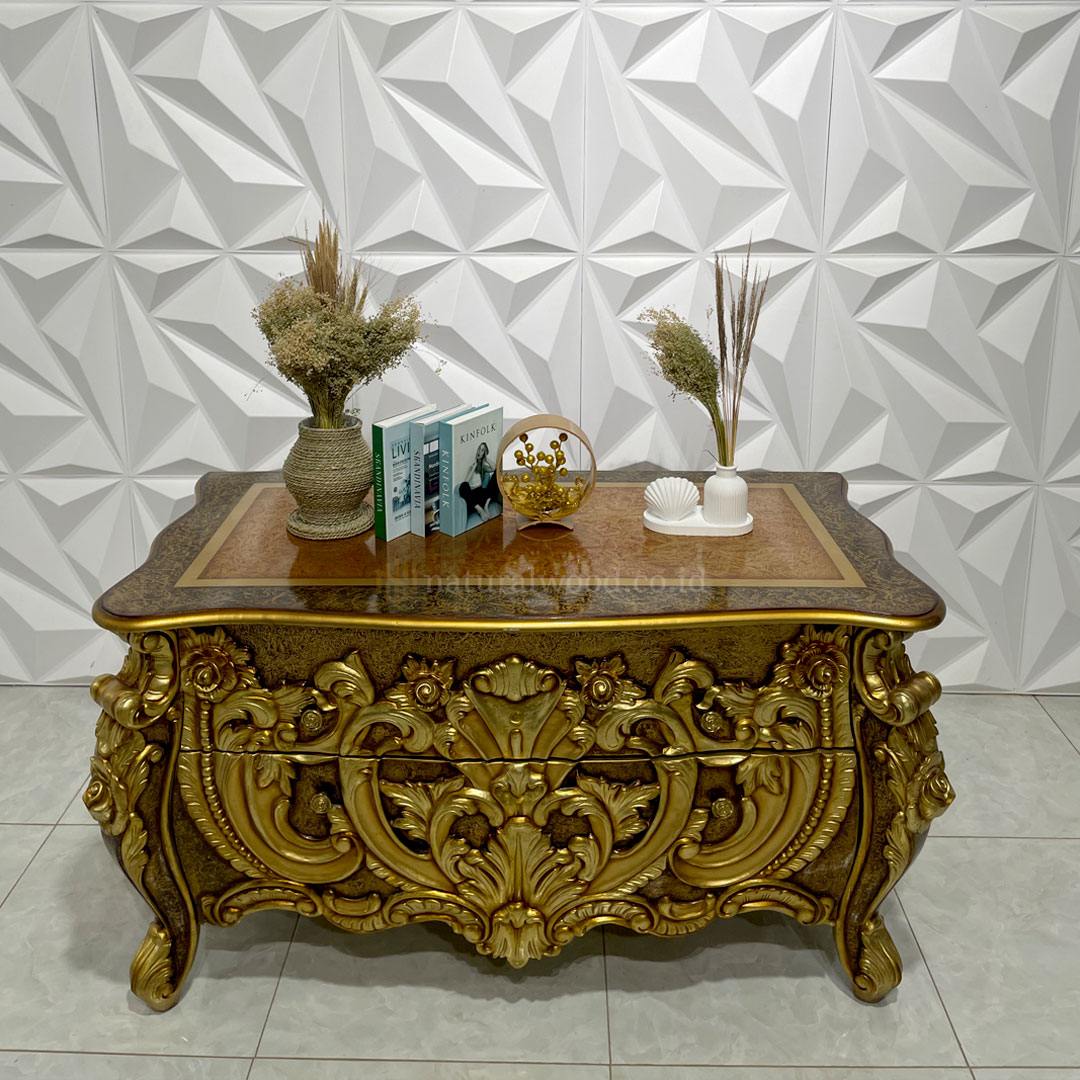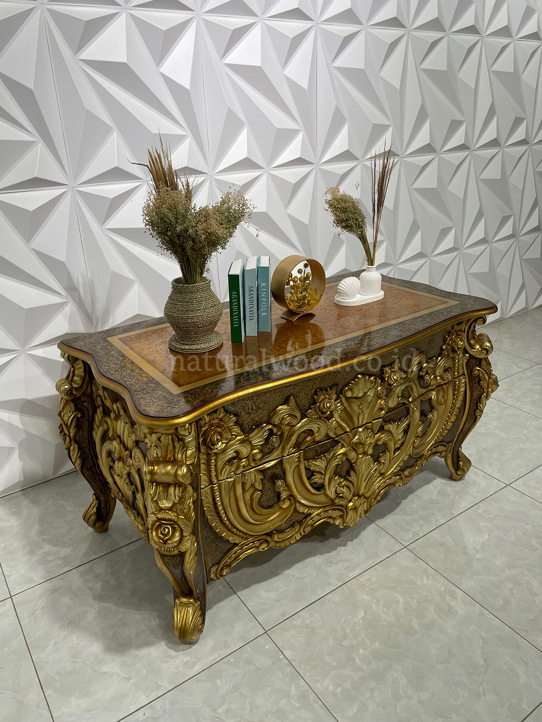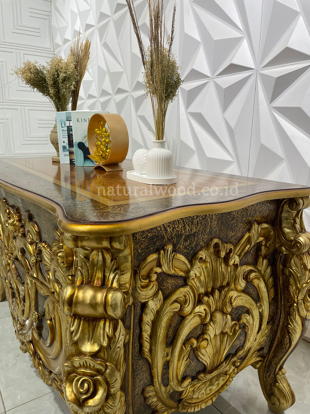 Desain klasik mewah pada prasmanan TV ini terlihat dari detail ukiran halus, proporsi yang seimbang, serta finishing natural yang menampilkan keindahan serat kayu jati. Kombinasi antara gaya klasik dan sentuhan modern menjadikannya sebagai pusat perhatian yang menambah kesan premium pada ruangan Anda.