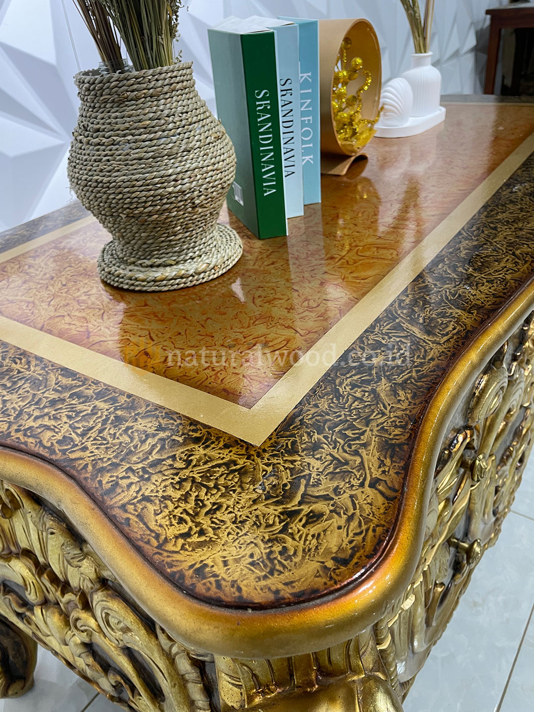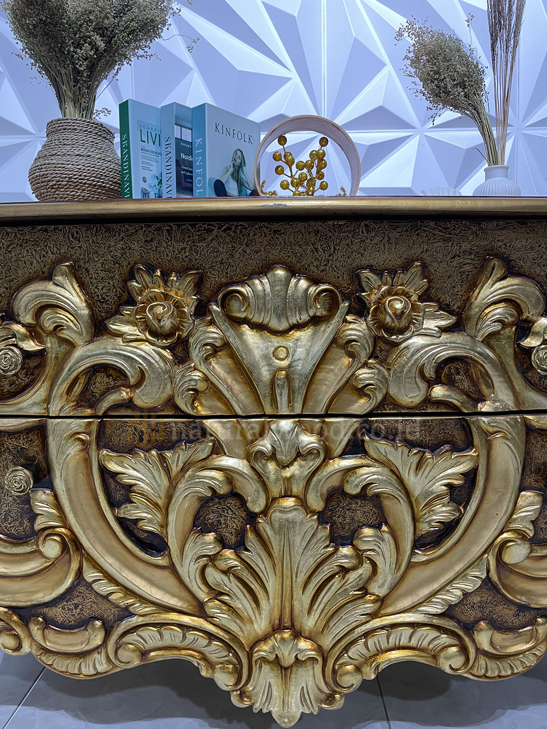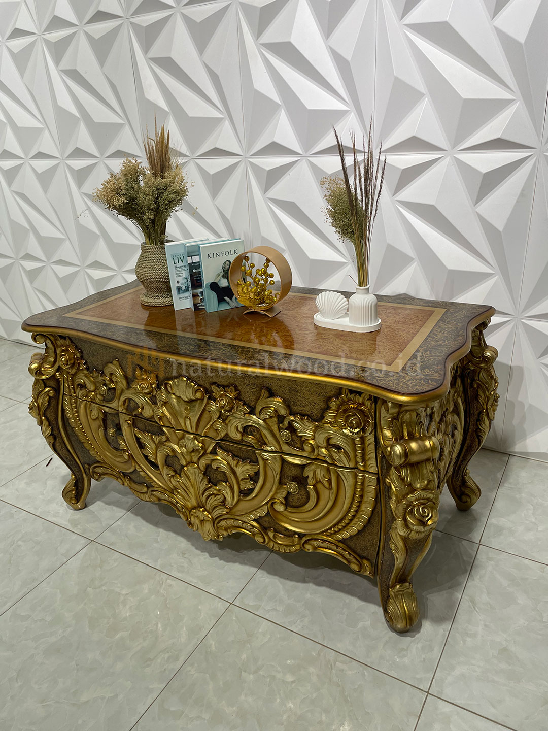 Desain klasik mewah pada prasmanan TV ini terlihat dari detail ukiran halus, proporsi yang seimbang, serta finishing natural yang menampilkan keindahan serat kayu jati. Kombinasi antara gaya klasik dan sentuhan modern menjadikannya sebagai pusat perhatian yang menambah kesan premium pada ruangan Anda.
