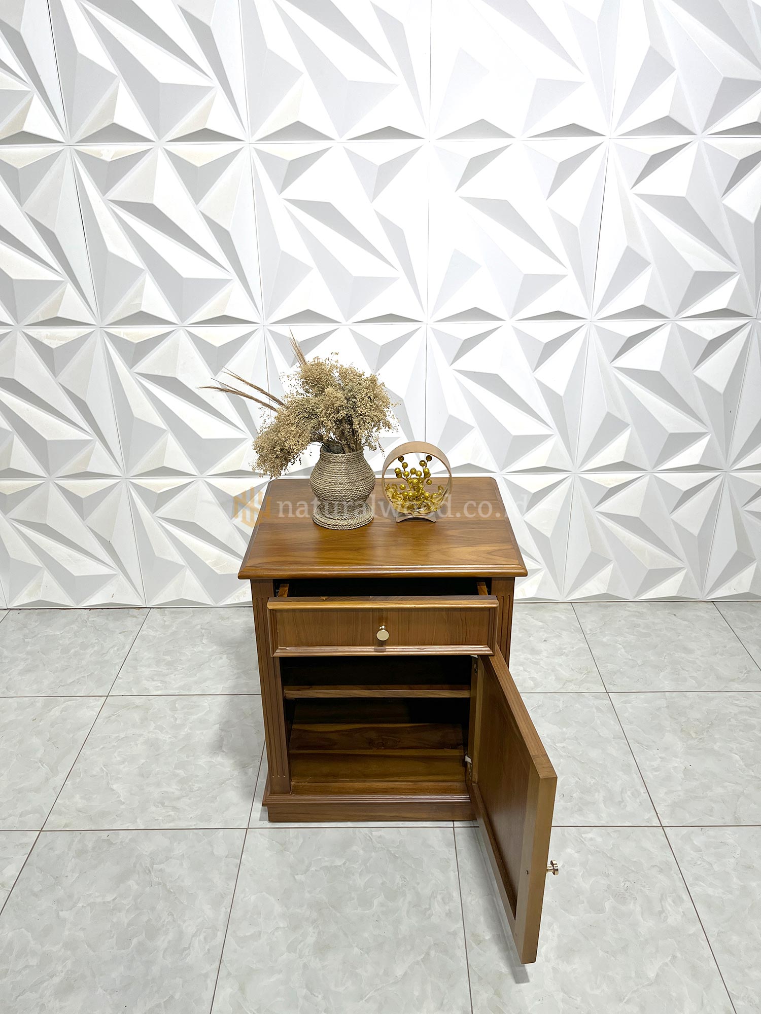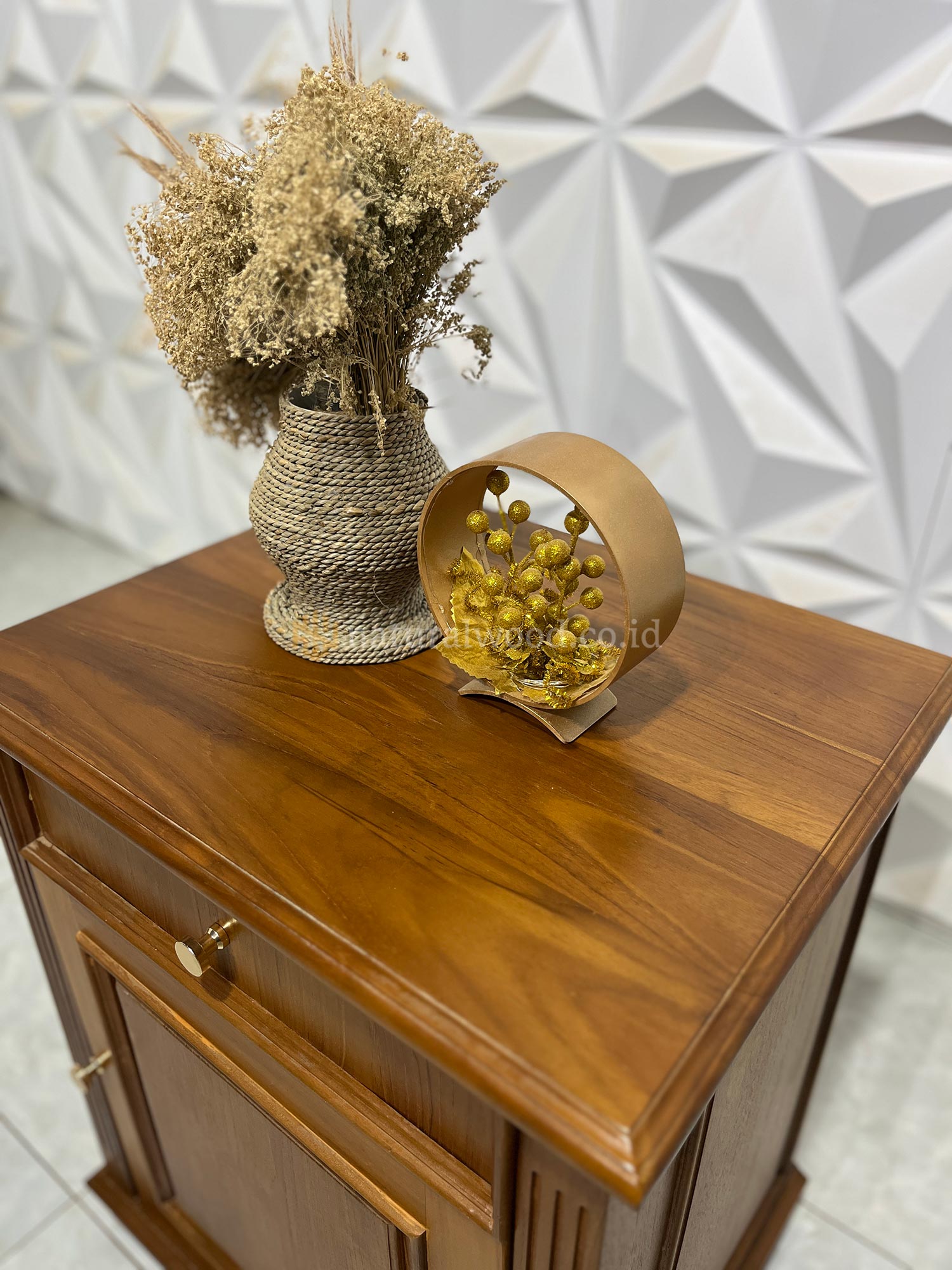 Sebagai produk asli Furniture Jepara , nakas ini dibuat menggunakan kayu jati pilihan grade A yang terkenal kuat, tidak mudah melengkung, serta tahan terhadap rayap dan perubahan cuaca. Konstruksi kokoh memastikan penggunaan jangka panjang, sementara proses finishing natural memberikan perlindungan sekaligus menonjolkan motif serat jati yang eksklusif. Detail pengerjaan dikerjakan oleh pengrajin berpengalaman, menghasilkan permukaan yang rapi, halus, dan berkualitas premium.