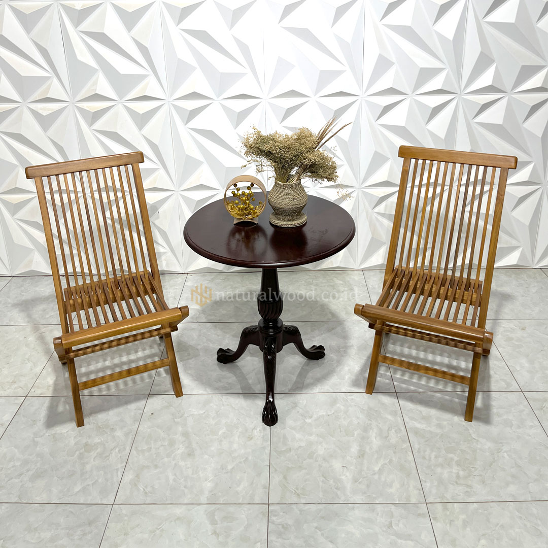 Sebagai produk unggulan Furniture Jepara , set kursi ini diproses oleh pengrajin berpengalaman yang mengutamakan kekuatan konstruksi dan kerapian finishing. Serat kayu jati yang tampak alami memberikan kesan alami yang hangat, sedangkan finishing halus membuat furnitur ini tahan terhadap cuaca, panas matahari, maupun kelembapan. Inilah alasan mengapa kursi lipat jati dari Natural Wood sangat cocok untuk penggunaan outdoor jangka panjang.